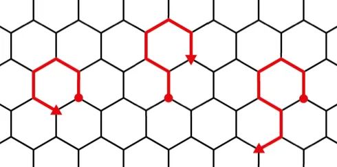 “想象一下,你现在在一个蜂窝面前,”度米尼尔-柯平说,蜂箱的形成了平面上的六边形平铺,蜂箱壁的挡板和挡板转角标记成为六边形(蜂窝格子)的点和边。你选择一个点作为起点,然后在六边形的边界上行走,但有一点,你不能回到任何之前走过的地方,边和点都不行。这个规则叫做自规避行走。